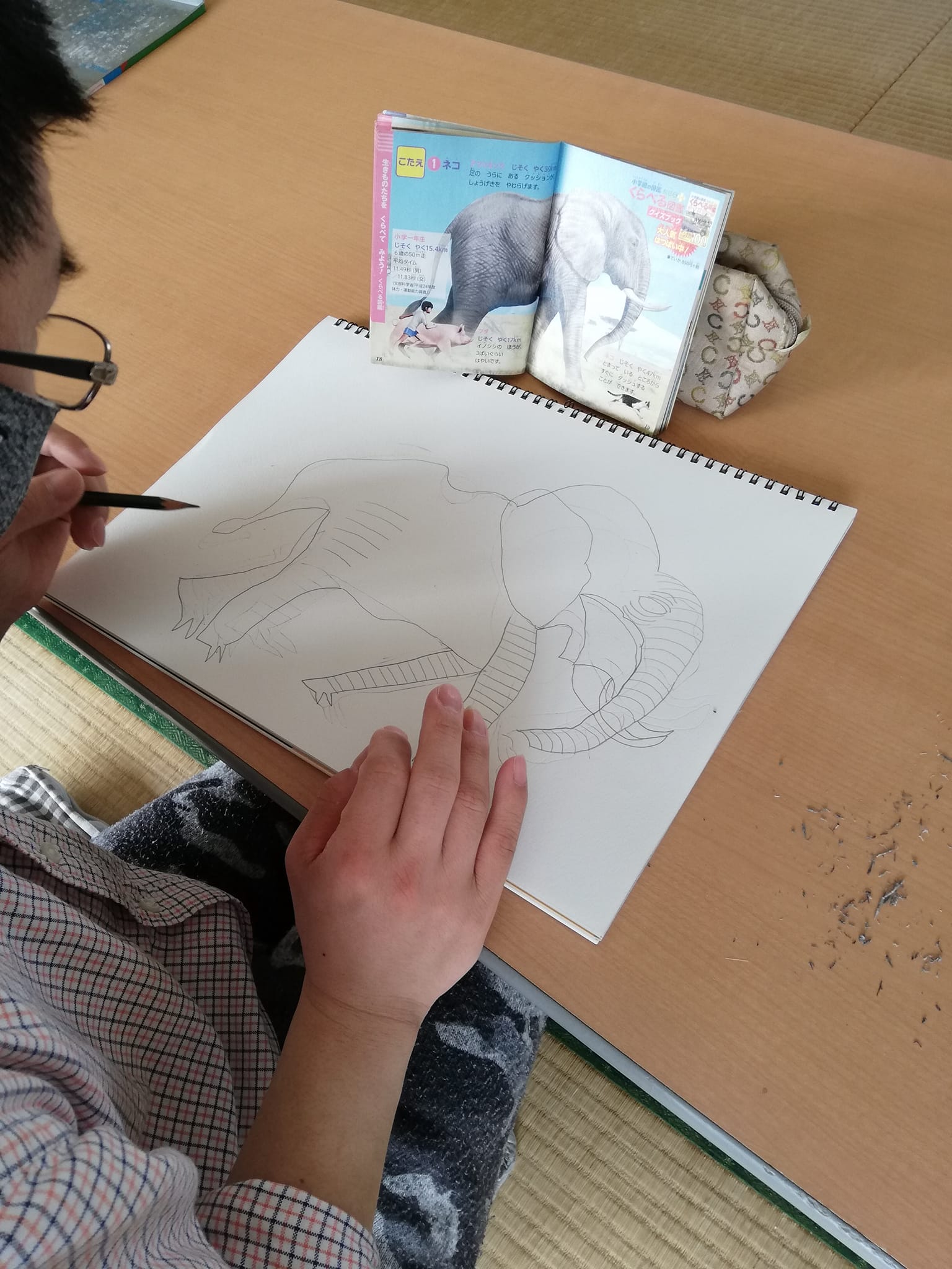 見本の動物図鑑を何回も、何回も確認しながら描いては消し、描いては消しを繰り返して作品を仕上げていました。