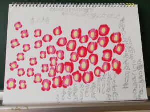 今日は震災に想いを寄せて春の梅の絵と、ふるさとの歌詞を描いていました。