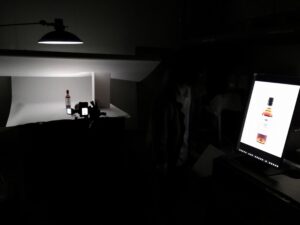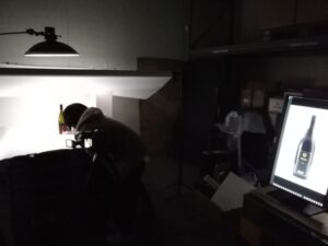 塵ひとつ付かないように、1点1点ていねいにエアーで埃をとり、ボトルを拭きあげ、ライティング、ボトルに映り込む背景、角度…