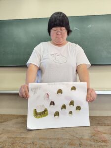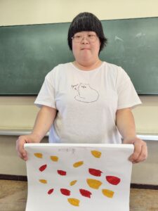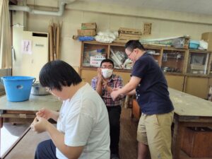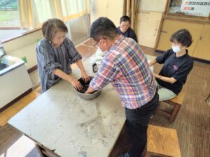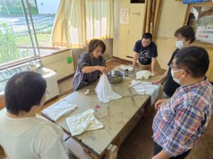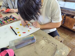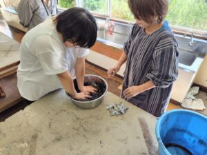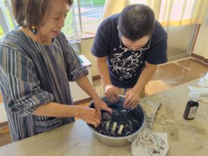 今日は、アーティストのお母さんの指導の下、墨汁を使った染物体験をしました。