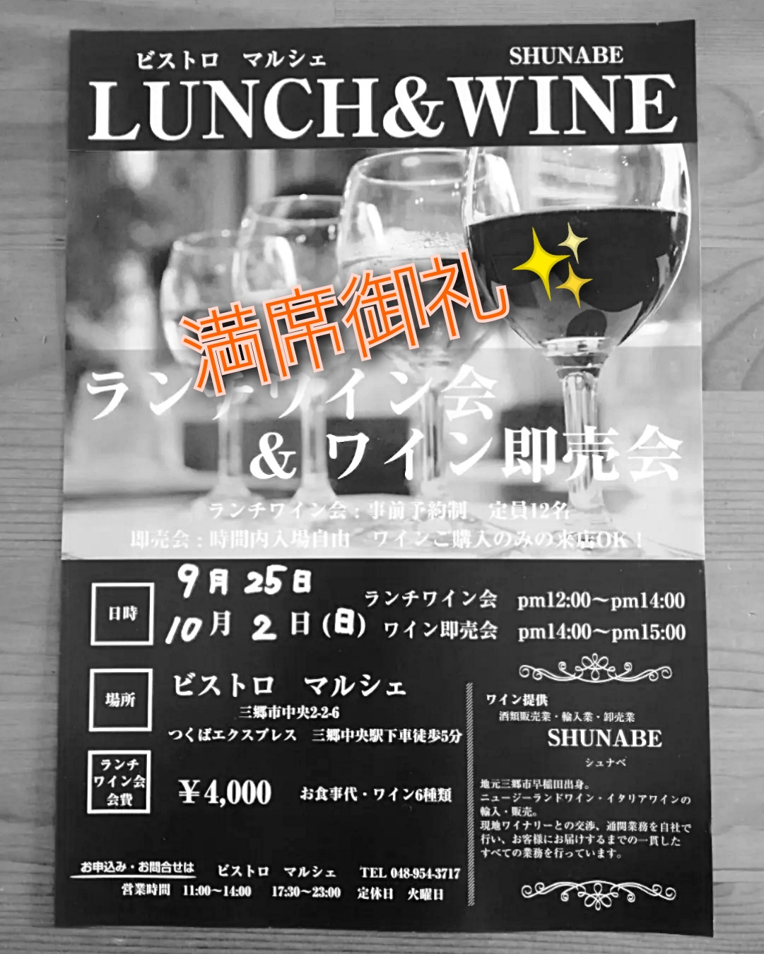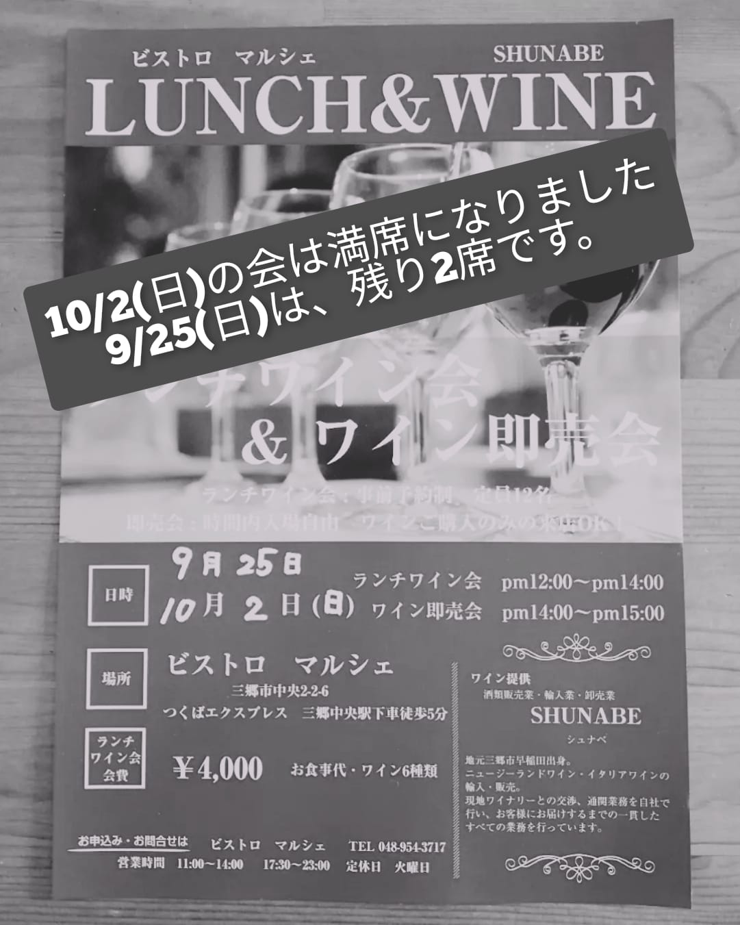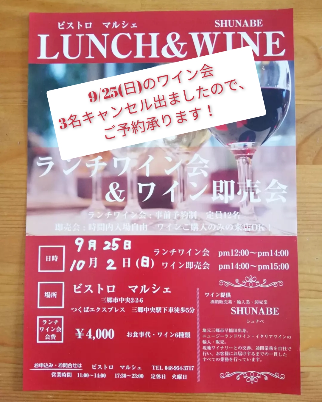 9/25(日) ランチワイン会 キャンセルでました。